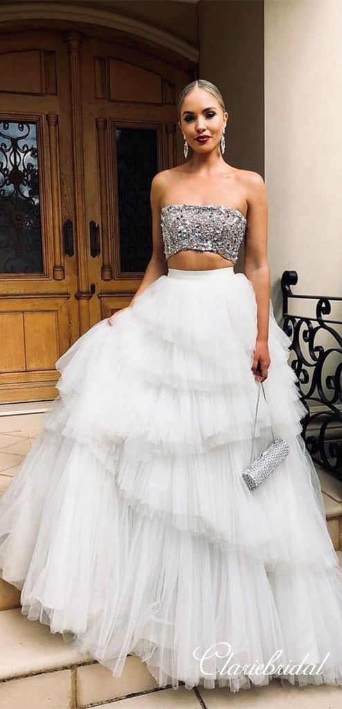 2 Pieces Beaded Top Fluffy Tulle Prom Dresses, Long Prom Dresses, Chic Long Prom Dresses