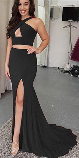 2 Pieces Jersey Prom Dresses, Mermaid Prom Dresses, Side Silt Prom Dresses, Simple Prom Dresses