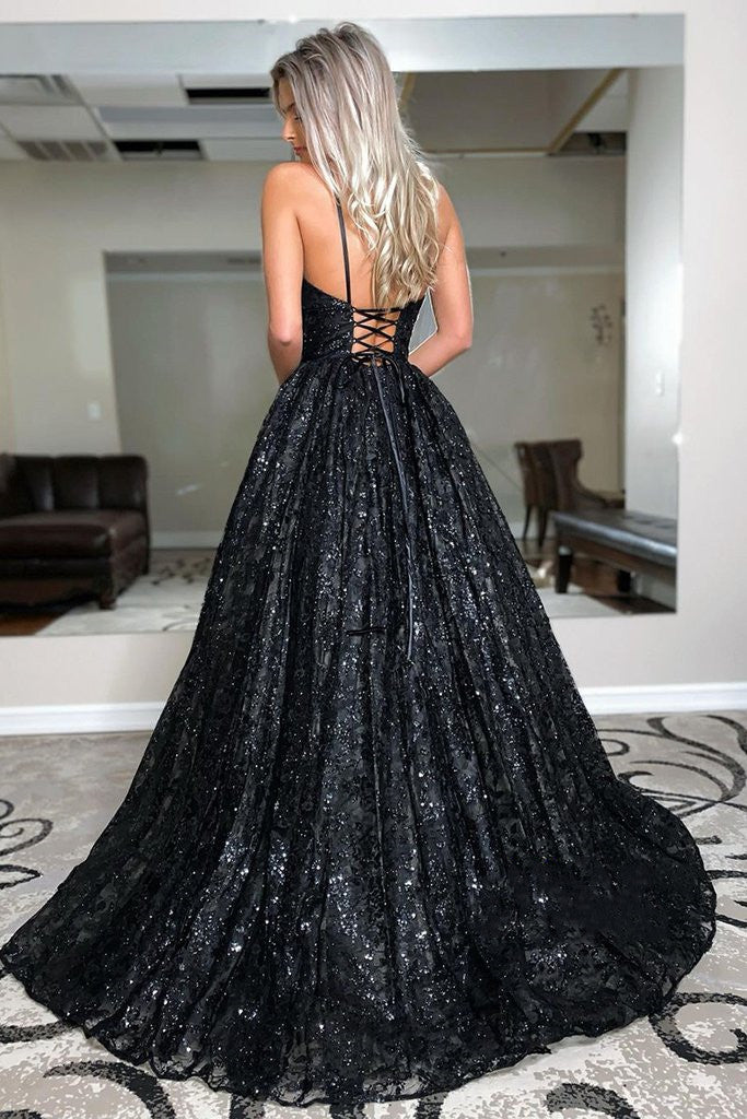 Black A-line Sequins Long Prom Dresses, Plunging V-neck 2021 Prom Dresses Long