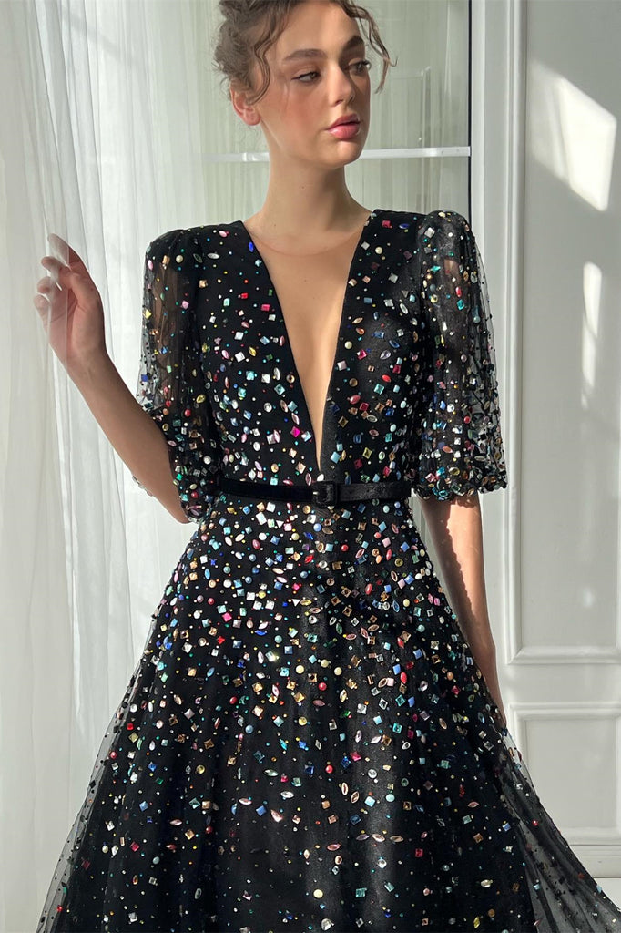 Deep V-neck Bubble Sleeves Colorful Rhinestones Prom Dresses, Black Maxi Dresses, Party Dresses, Formal Evening Dresses