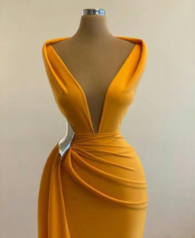 Deep V-neck Long Sheath Yellow Prom Dresses, Formal Evening Dresses, 2021 Prom Dresses
