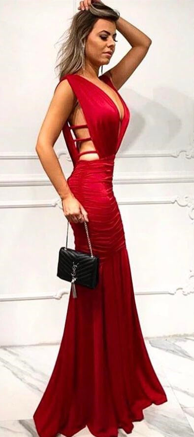 Deep V-neck Red Mermaid Prom Dresses, Long Prom Dresses, Sexy Prom Dresses, Newest Prom Dresses
