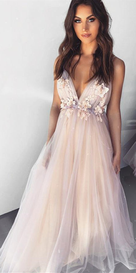 Deep V-neck Tulle Apppliques Prom Dresses, Long Prom Dresses, Popular Prom Dresses