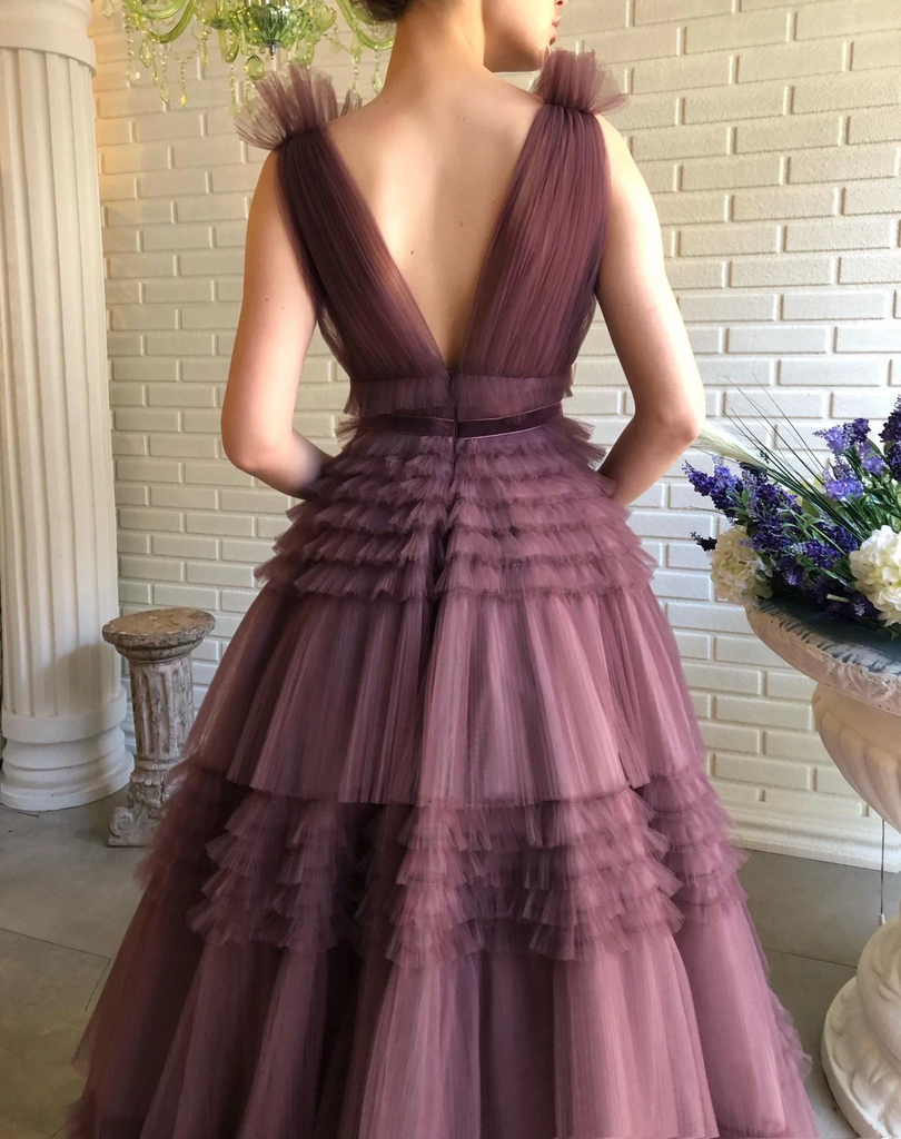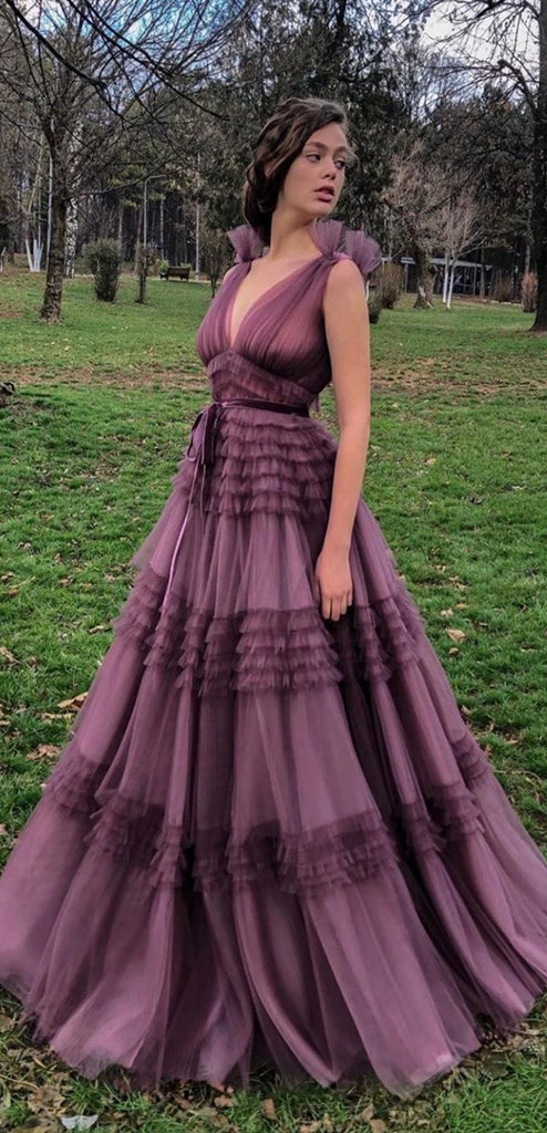 Dusty Purple Long A-line Prom Dresses, Chic Tulle Prom Dresses, High Waist Prom Dresses