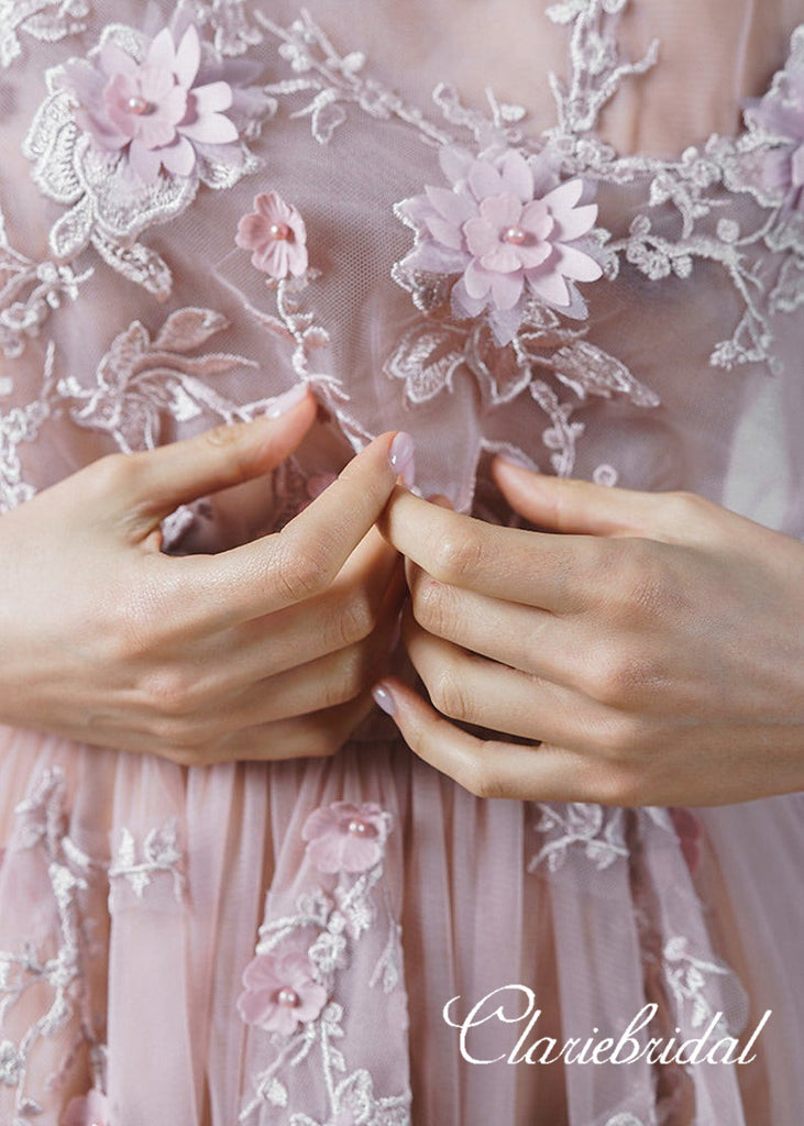 Dusty Rose Lace Tulle Long Prom Dresses, A-line Prom Dresses, Newest Prom Dresses