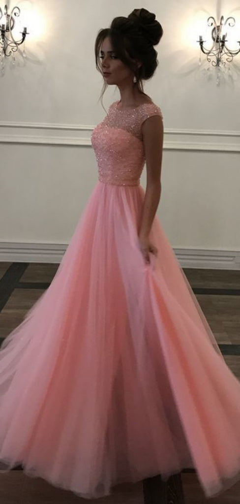 Elegant Beaded Long Prom Dresses, 2020 Prom Dresses, Cap Sleeves Prom Dresses