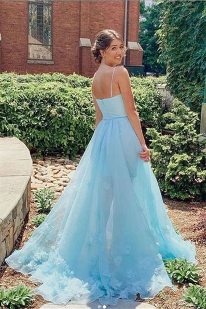 High Low Light Blue A-line Long Prom Dresses, 2021 Evening Party Prom Dresses