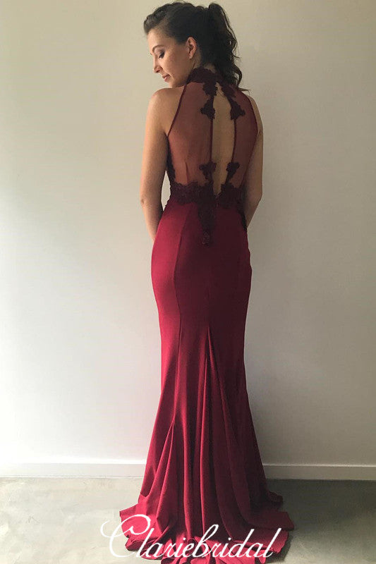 High Neck Maroon Lace Jersey Mermaid Prom Dresses