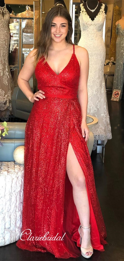High Slit Sequins Long Prom Dresses, Simple Prom Dresses, 2020 Prom Dresses