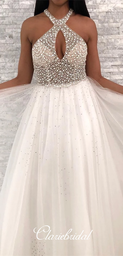 Key Hole Long A-line Ivory Beaded Tulle Prom Dresses, New Arrival Prom Dresses, 2020 Prom Dresses