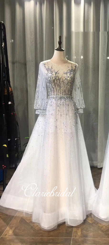 Long Sleeves Beaded Tulle Prom Dresses, Luxury Prom Dresses, 2020 Claire Deign Prom Dresses
