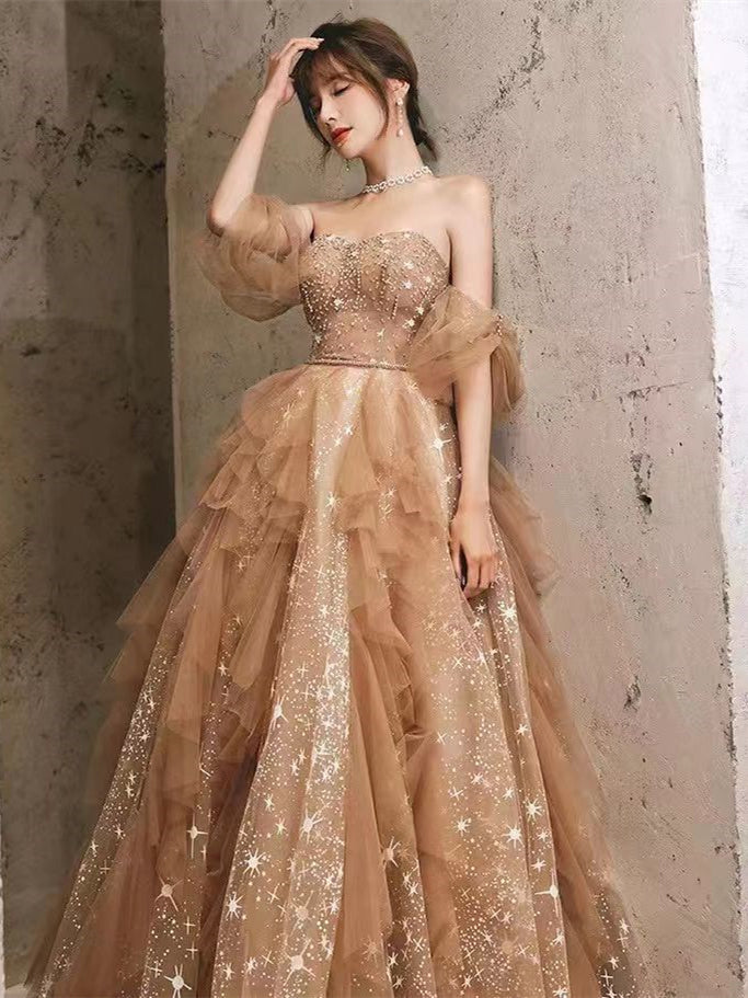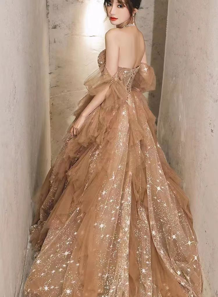 Lovely Dark Champagne Star Gliter Prom Dresses, Newest Prom Dresses, A-line Prom Dresses