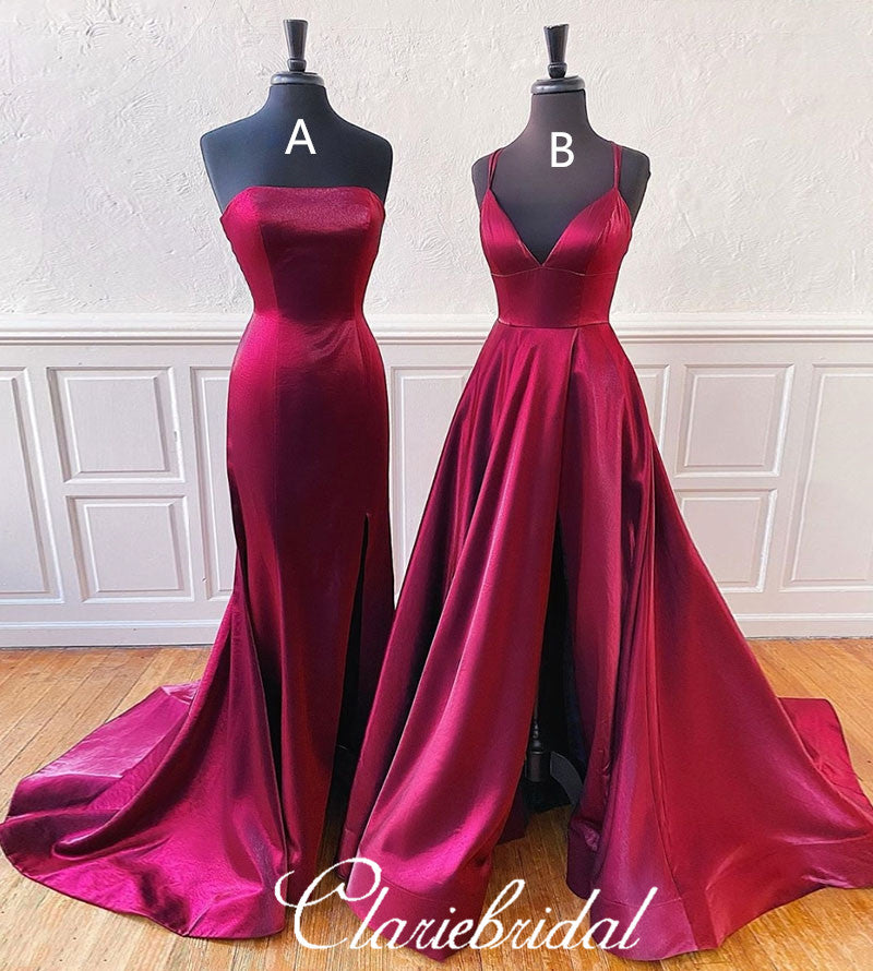Lovely Plum Satin Prom Dresses, Slit Prom Dresses, Simple Prom Dresses, Affordable Prom Dresses
