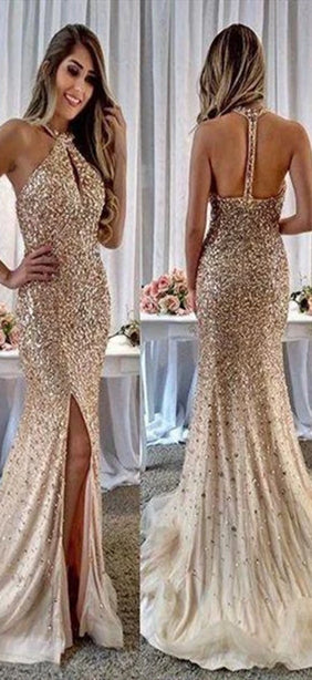 Luxury Rhinestone Beaded Long Mermaid Prom Dresses, Champagne Gold Prom Dresses