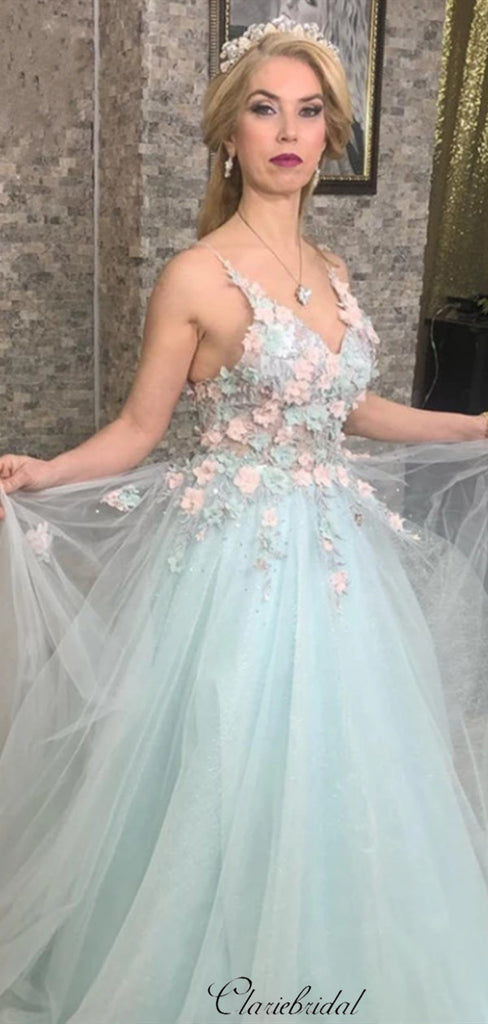 Modest Appliques Prom Dresses 2020, Straps Tulle Prom Dresses Long