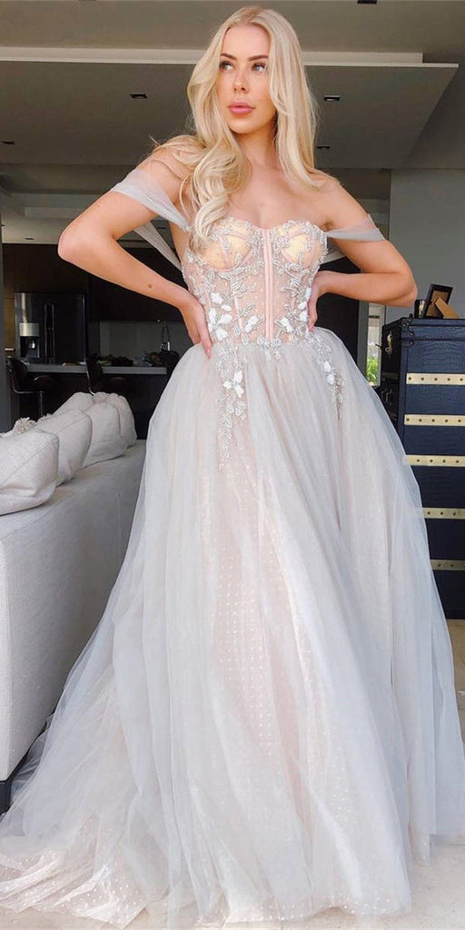 Off Shoulder A-line Prom Dresses, Lace Appliques Beaded Prom Evening Dresses