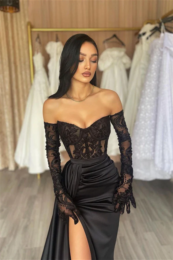 Off Shoulder Black Lace Satin Gown, High Side Slit Sexy Prom Dresses Long Prom Dresses, Newest Prom Dresses