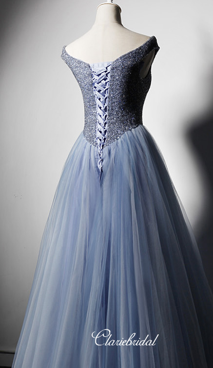 Off Shoulder Blue Beaded Tulle Princess Ball Gown, Long Prom Dresses, Lovely 2020 Prom Dresses
