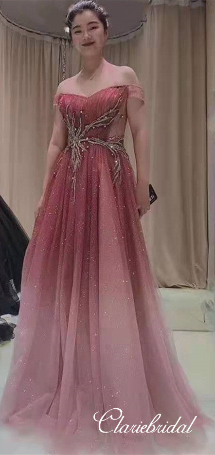Off Shoulder Long A-line Gradient Sequin Tulle Prom Dresses, Shiny Long Prom Dresses, New 2020 Prom Dresses