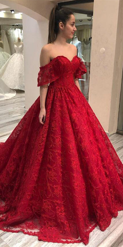 Off Shoulder Long A-line Red Lace Prom Dresses, Formal Dresses, Long Prom Dresses, 2020 Prom Dresses