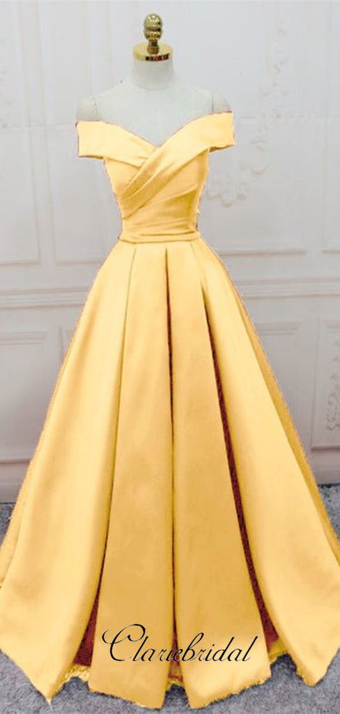 Off The Shoulder Satin Long Prom Dresses, Yellow A-line Prom Dresses, Custom Prom Dresses