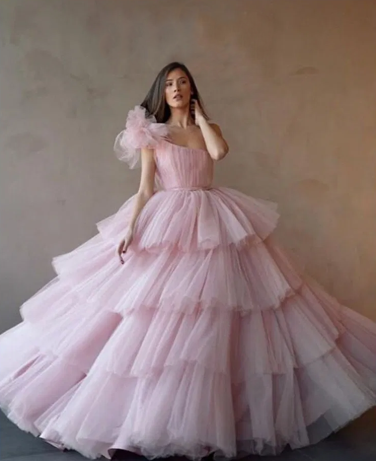One Shoulder Pink Layers Tulle Prom Dresses, Ball Gown Prom Dresses, 2021 Prom Dresses, Popular Prom Dresses