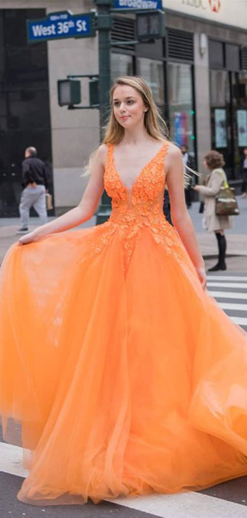 Orange Tulle A-Line Long Party Prom Dresses, Quality V-neck Charming 2021 Prom Dresses