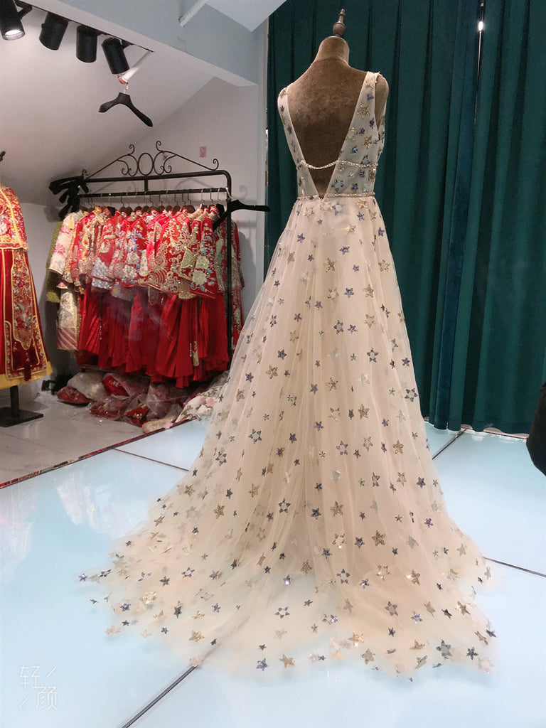 Popular Stars V Neck Long Prom Dresses, Princess Dresses, Girl Evening Party Dresses