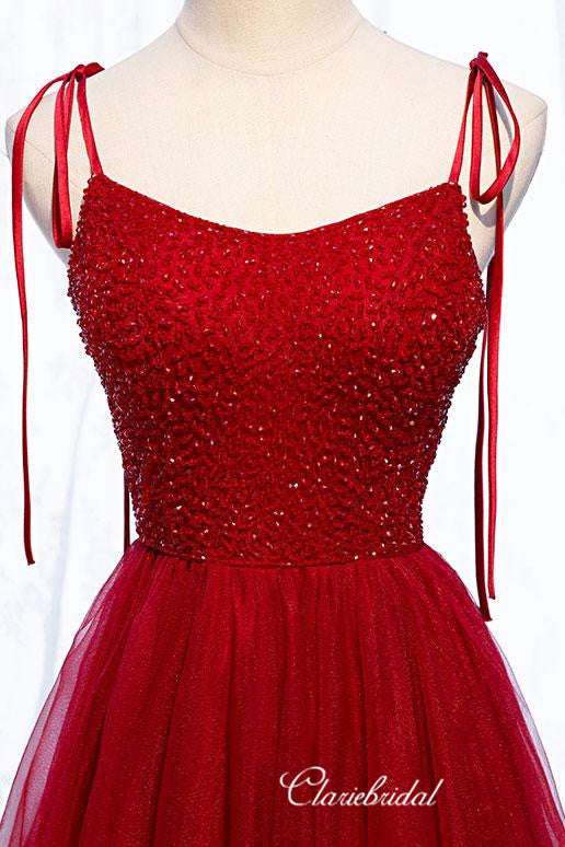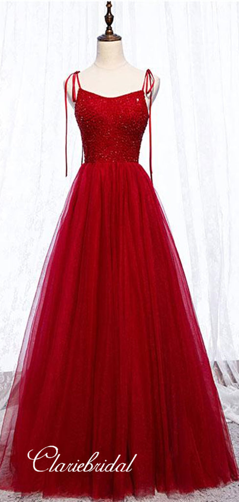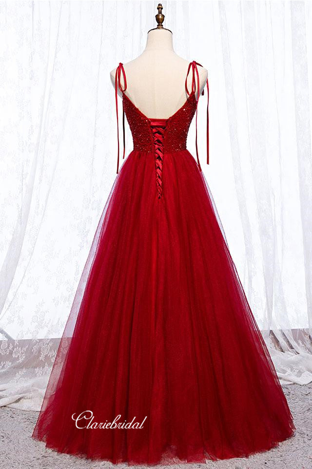 Red Color Tulle Prom Dresses, Beaded A-line Prom Dresses, Popular Newest Prom Dresses