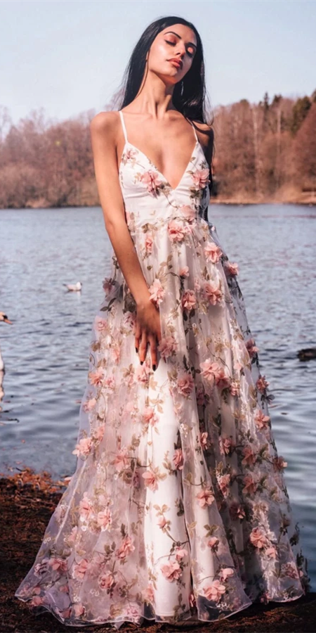 Spaghett Long A-line Floral Prom Dresses, Popular Prom Dresses, 2021 Prom Dresses