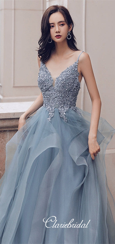 Spaghetti Long A-line Grey Tulle Lace Prom Dresses, Beaded Prom Dresses, Lovely Long Prom Dresses