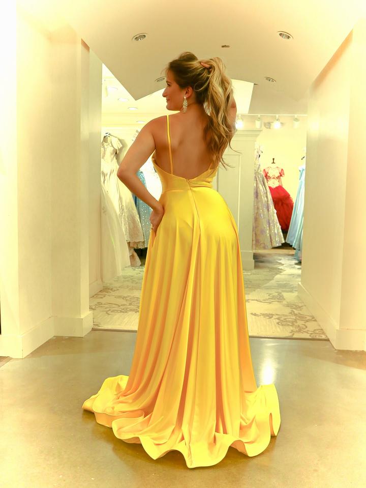 Spaghetti Long A-line Yellow Elastic Satin Prom Dresses, Simple Chic 2021 Prom Dresses