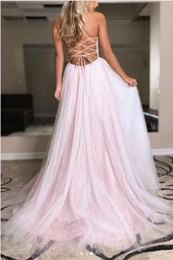Spaghetti Straps Beads 2021 Prom Dresses, Side Slit A-line Long Prom Dresses, Girl Dresses