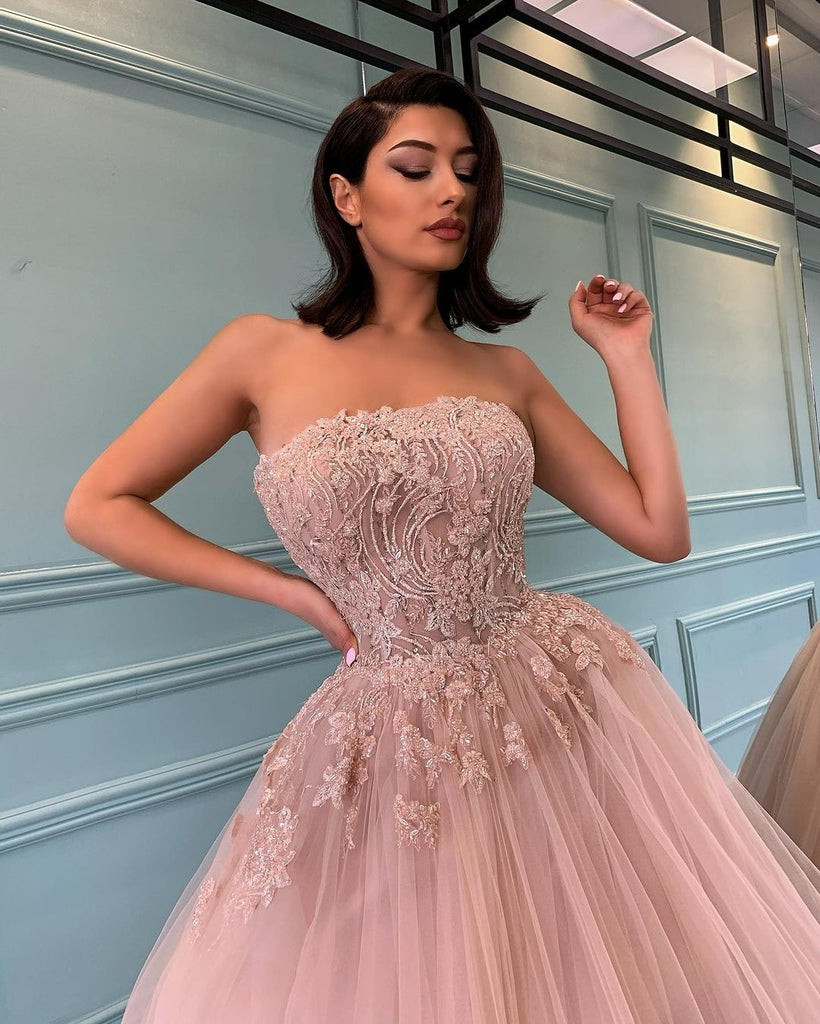 Strapless Pink Tulle Beaded Prom Dresses, A-line Ball Gown Quinceanera Dresses, Prom Dresses