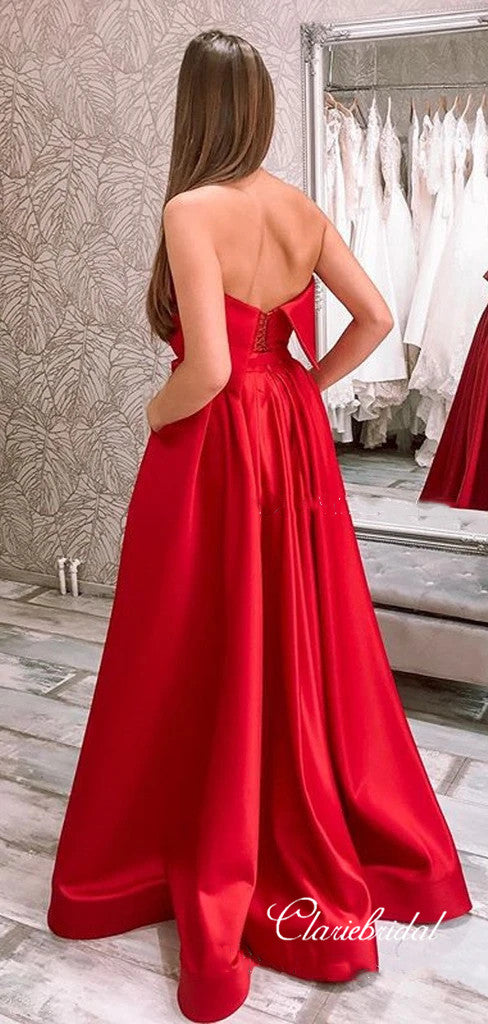 Strapless Red Color Satin Long Prom Dresses, Affordable Slit 2020 Prom Dresses