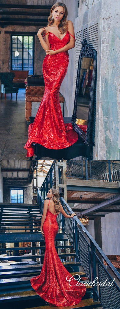 Straps Long Mermaid Red Sequin Prom Dresses, Newest Long Prom Dresses