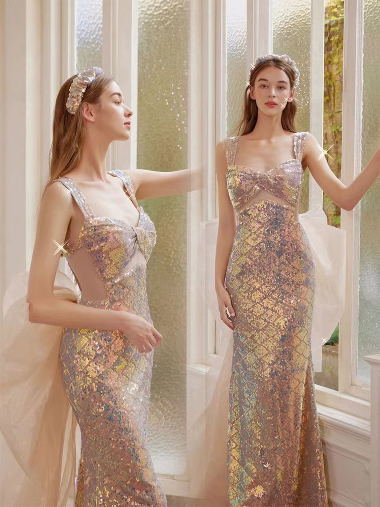 Straps Mermaid Shiny Prom Dresses, Mermaid Collection Long Prom Dresses, Newest 2022 Party Dresses With Detachable Train