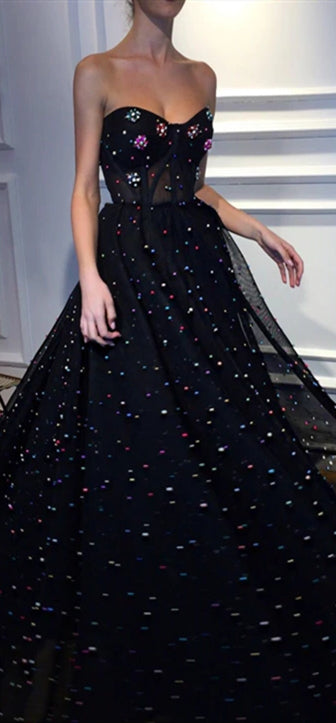 Sweetheart Long A-line Black Tulle Beaded Prom Dresses, Long Prom Dresses, 2020 Prom Dresses