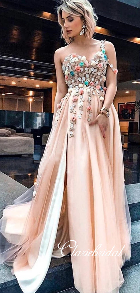Sweetheart Long A-line Lace Appliques Long Prom Dresses, Side Slit Prom Dresses