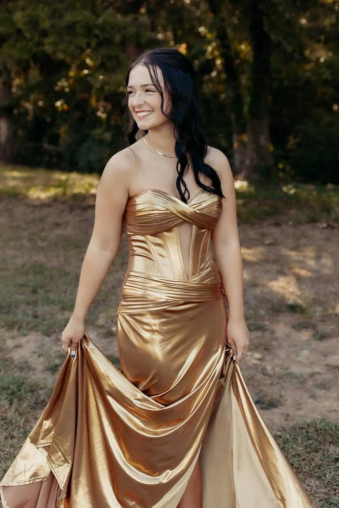 Sweetheart Long Mermaid Metalic Gold Prom Dresses With Side Slit, Newest 2025 Prom Dresses