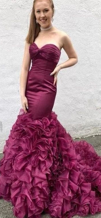 Sweetheart Long Mermaid Plum Satin Organza Prom Dresses, Long Prom Dresses, 2020 Prom Dresses