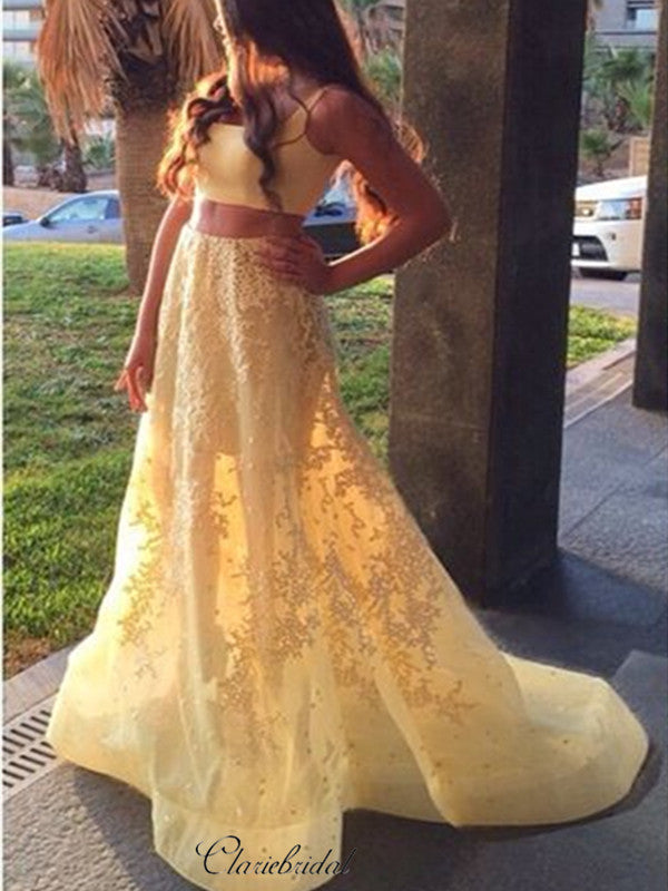Two Pieces Yellow Prom Dresses Long, A-line Lace Prom Dresses