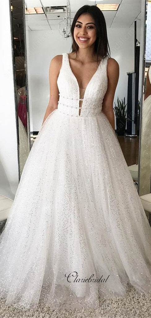 V-neck Glitter Long Prom Dresses, Shiny 2020 Prom Dresses, Fashion Prom Dresses