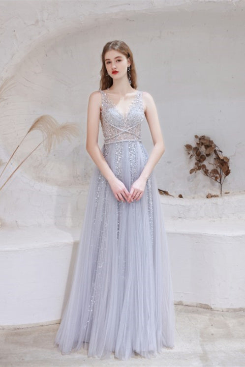 V-neck Light Grey Shiny Sequin Beaded Prom Dresses, Newest Prom Dresses, 2021 Prom Dresses