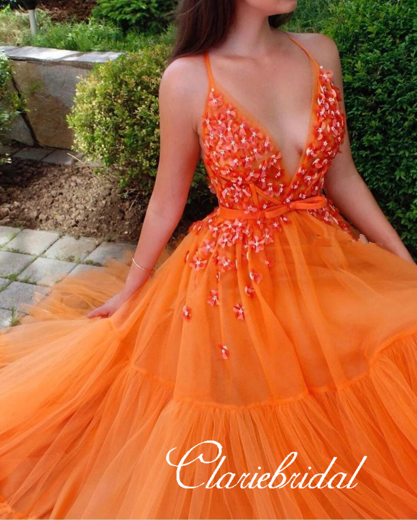 V-neck Long A-line Bright Orange Prom Dresses, Tulle Prom Dresses, Long Prom Dresses