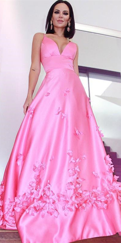 V-neck Long A-line Pink Satin Prom Dresses, 3D Floral Prom Dresses, 2021 Prom Dresses