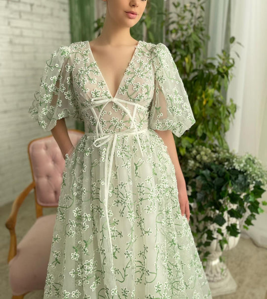 V-neck Puff Sleeves Long A-line Prom Dresses, Lovely Princess Prom Dresses, 2022 Prom Dresses, Newest Prom Dresses
