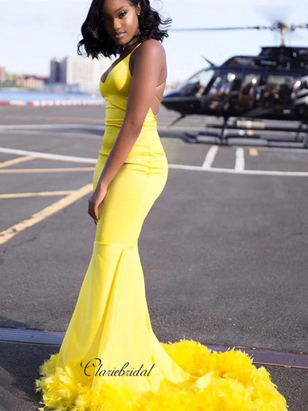 V-neck Spaghetti Straps Long Prom Dresses, Open Back Sexy Mermaid Prom Dresses