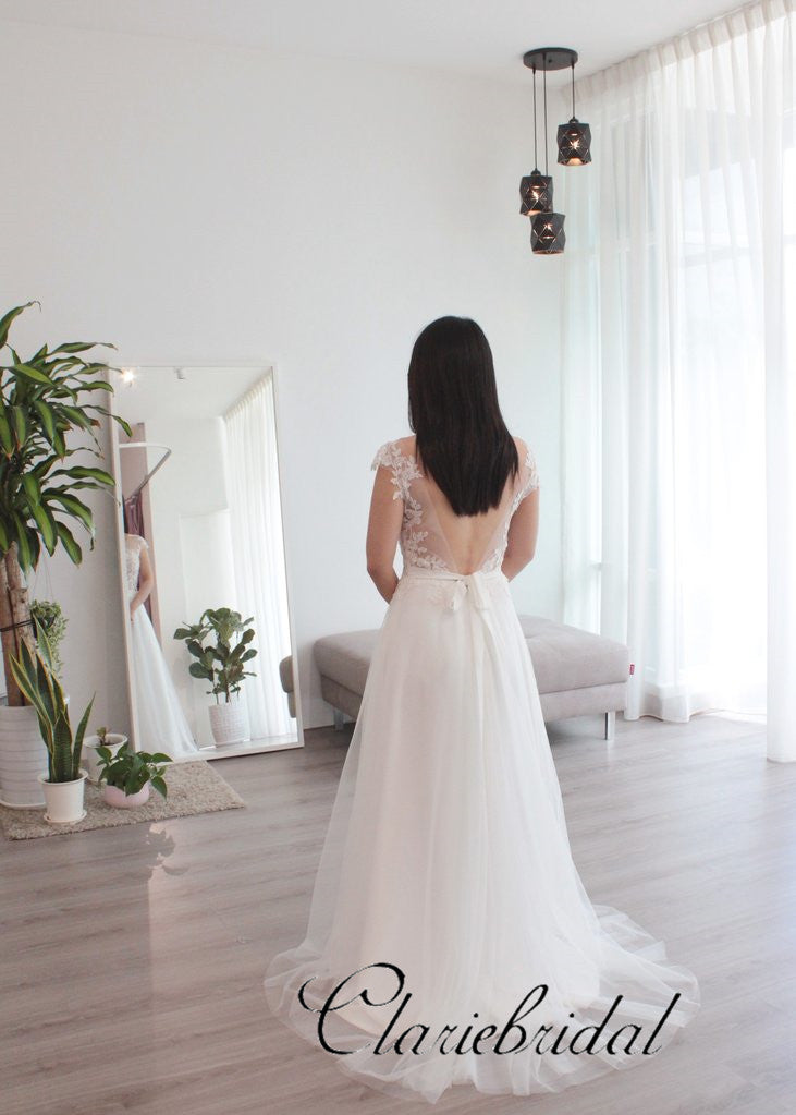Cap Sleeves A-line Simple Lace Tulle Wedding Dresses