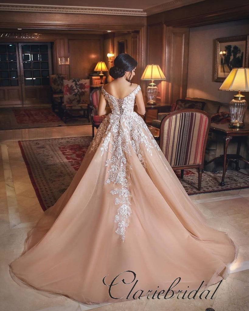 Off Shoulder Lace Tulle A-line Wedding Dresses, Elegant Wedding Dresses